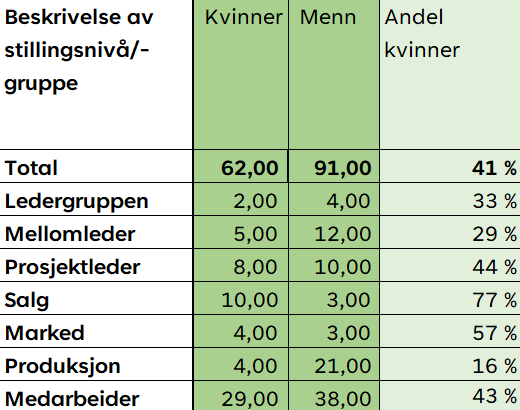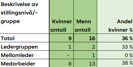 Tallene vises i prosent på grunn av få ansatte i enkelte kategorier. Annen fremstilling ville gitt stor gjennomsiktighet i tallene. Administrerende direktør er ikke inkludert i tallene over.