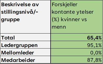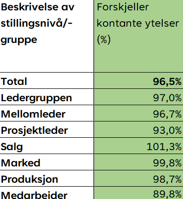 *Tallene viser % vis forskjeller i kontante ytelser til kvinner vs menn for de ulike stillingskategoriene.